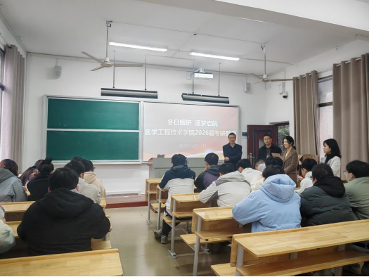 初冬微寒,研考备战正酣。12月12日下午,医学工程技术学院在北校区二教404开展2026届考研学子慰问活动。学院院长莫中成、党委副书记罗荃、副院长孙静、刘海桥亲临现场,为冲刺阶段的考研学子送上冬日的温暖与诚挚祝福。
